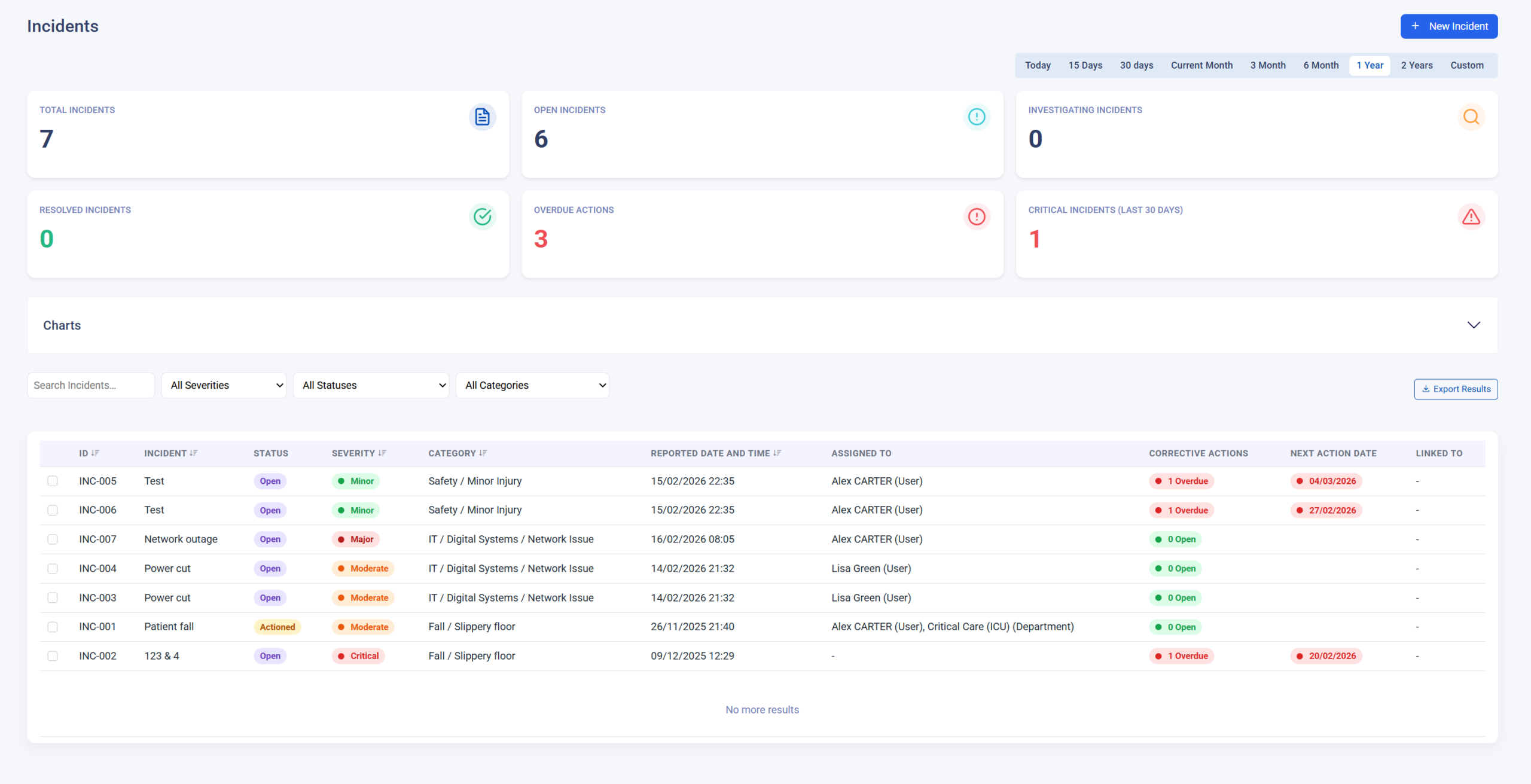 Μπορείτε πλέον να καταγράφετε συμβάντα σε δομημένο μητρώο και να τα διαχειρίζεστε μέσω Διορθωτικών Ενεργειών (με υπεύθυνο και προθεσμία). Αυτό βοηθά στην καθαρή τεκμηρίωση και στη σωστή παρακολούθηση μέχρι την ολοκλήρωση.