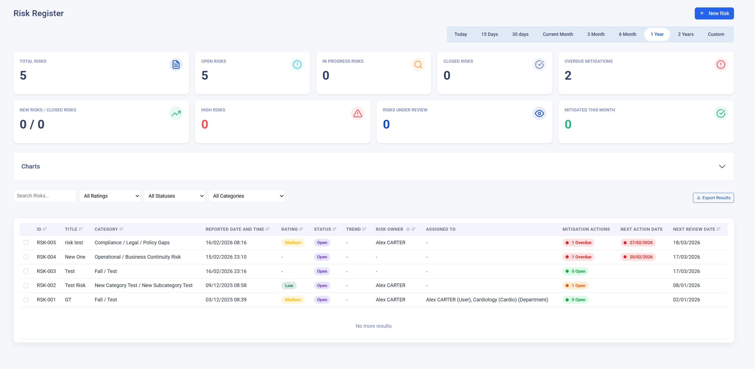 Προστέθηκε πλήρες Μητρώο Κινδύνων, με ιδιοκτησία κινδύνου, ενέργειες μετριασμού και κύκλο αναθεώρησης. Έτσι μπορείτε να διαχειρίζεστε κινδύνους οργανωμένα, με σαφή υπευθυνότητα και προθεσμίες.